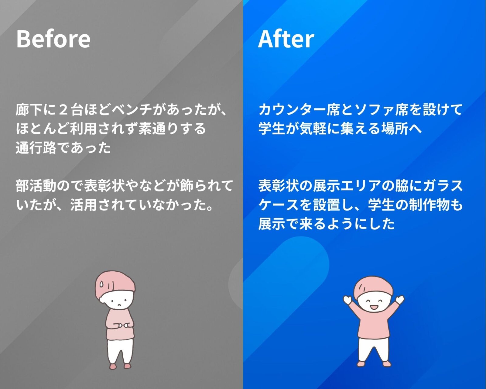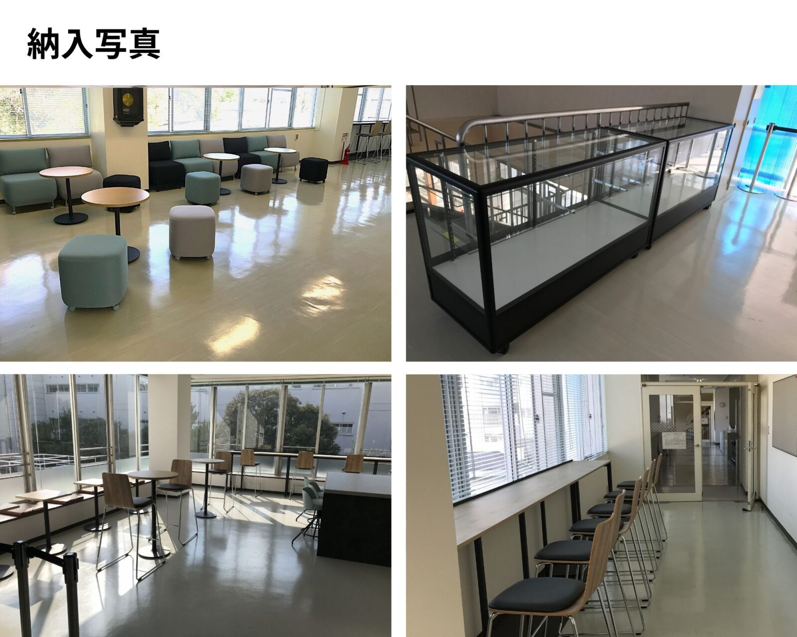 通行路として使われていた広いスペースを学生が集まる憩いの場になるように構築させていただきました。