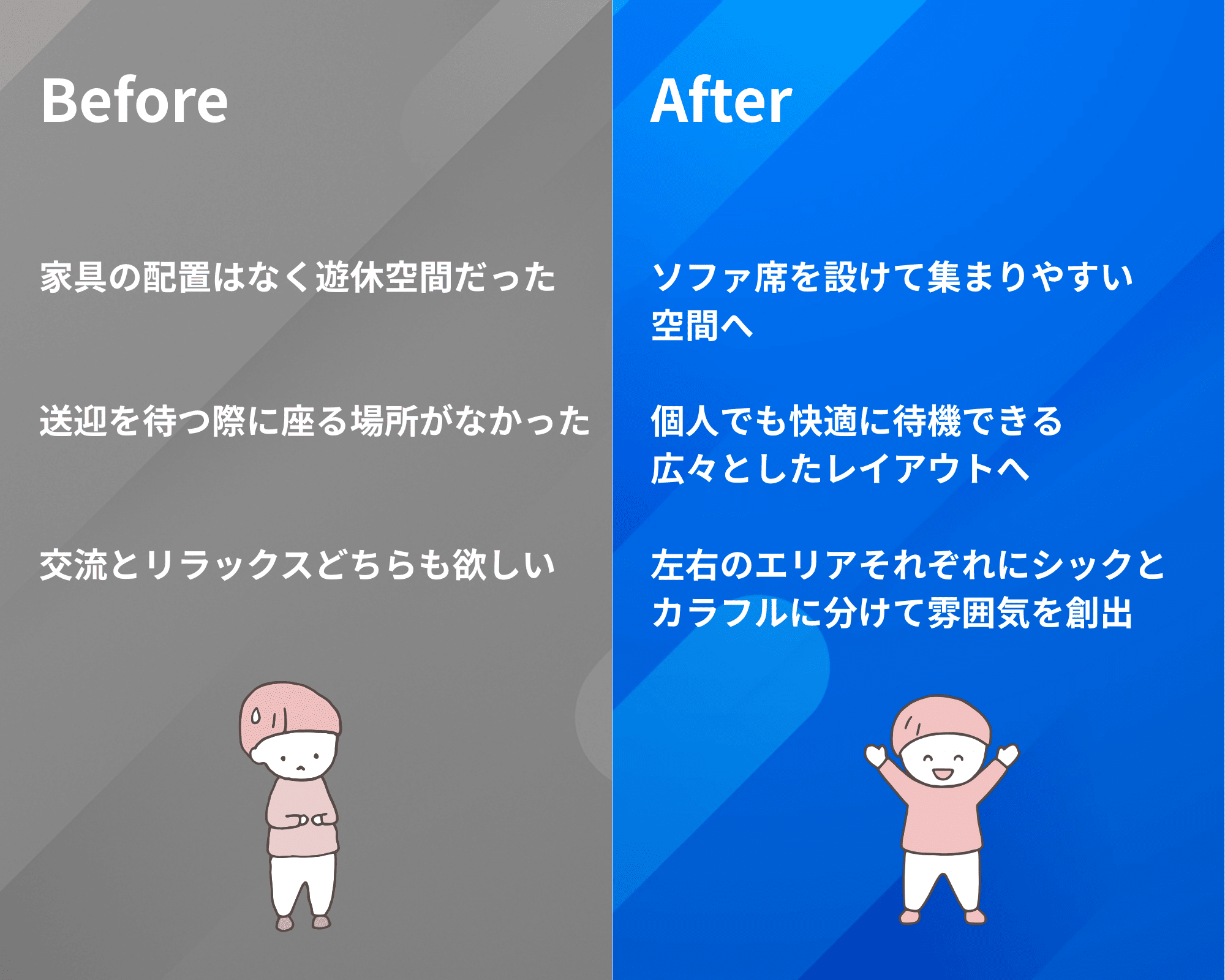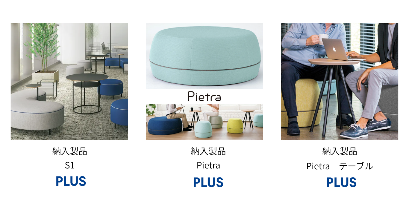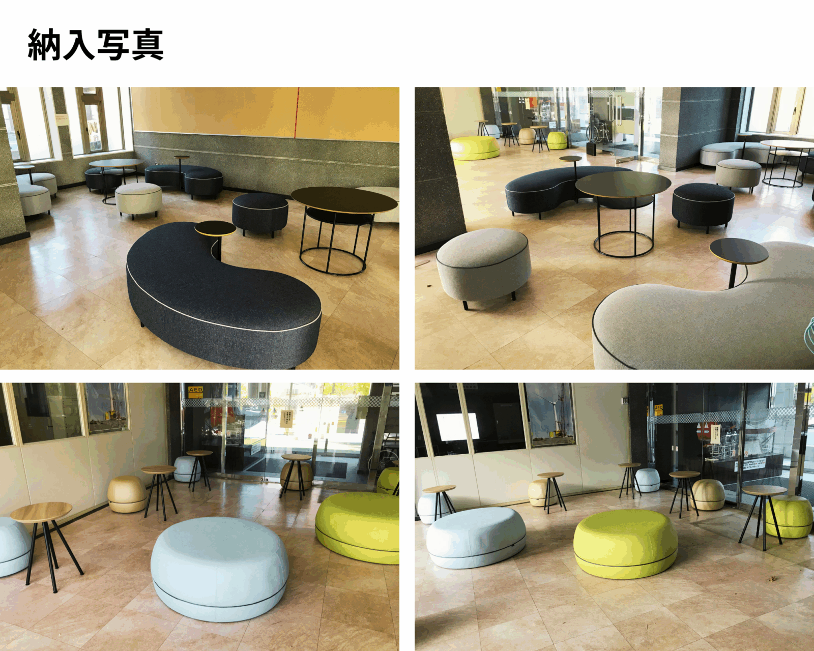 遊休空間となっていたスペースにソファを配置して、個人でもグループでもくつろげるスペースに構築させていただきました。
